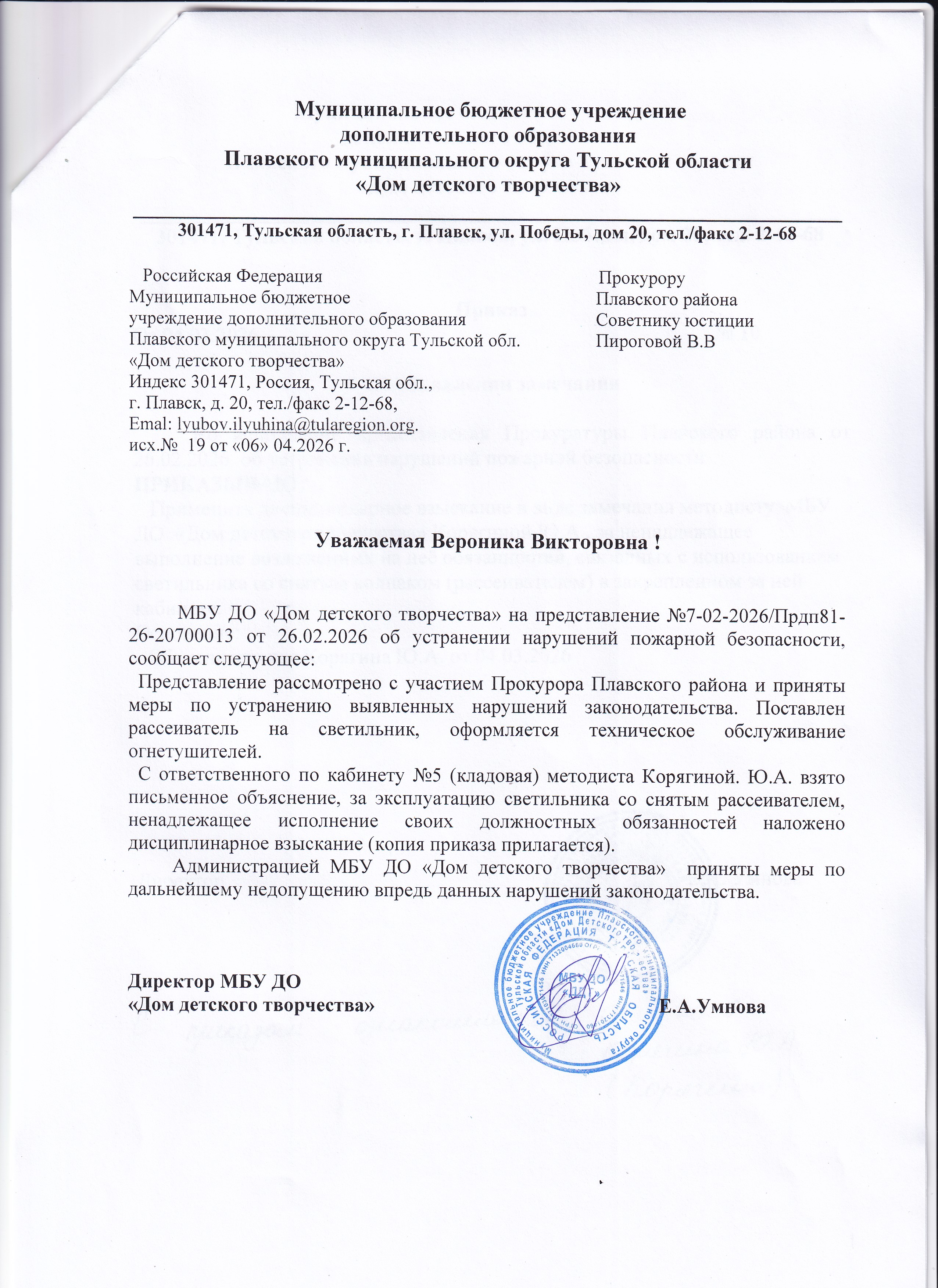 Ответ в прокуратуру Плавского района 2021